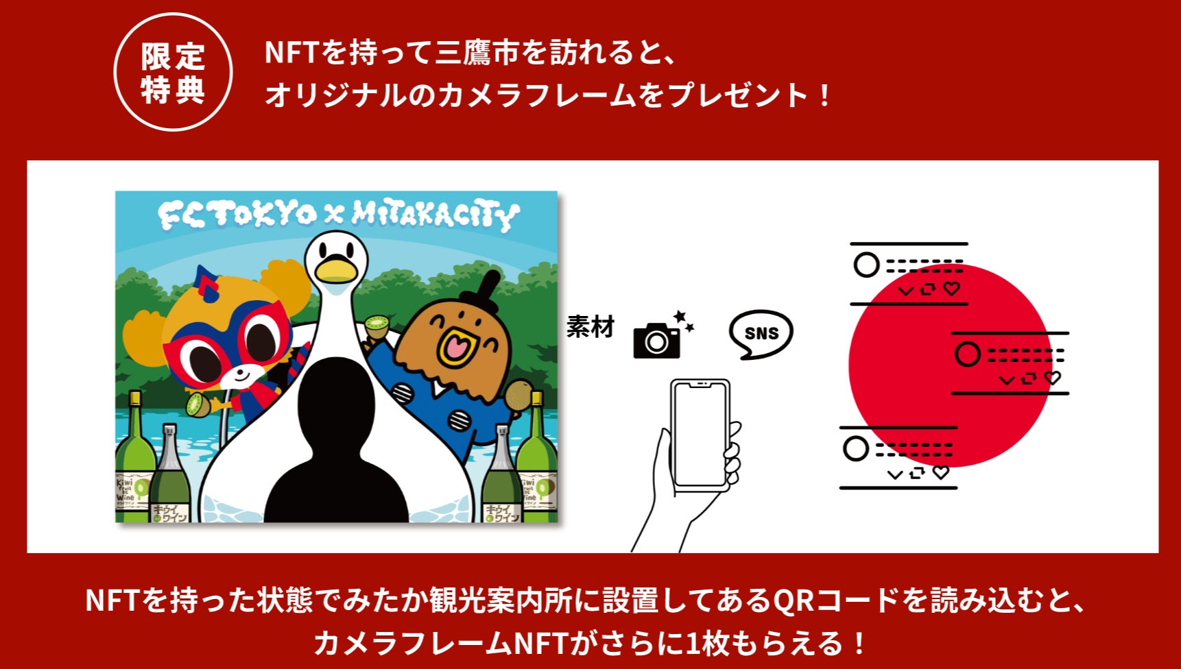 東京都三鷹市へ赴き、みたか観光案内所に設置してある二次元コードを読み取ると、カメラフレームNFTがもらえます。そのNFTに紐づいたカメラフレーム機能が解放され、三鷹のまちをPRするキャラクター「たかじょうくん」、FC東京のマスコットキャラクター「東京ドロンパ」と一緒にオリジナルアートカメラフームによりスマホによる写真撮影を楽しむことができます。