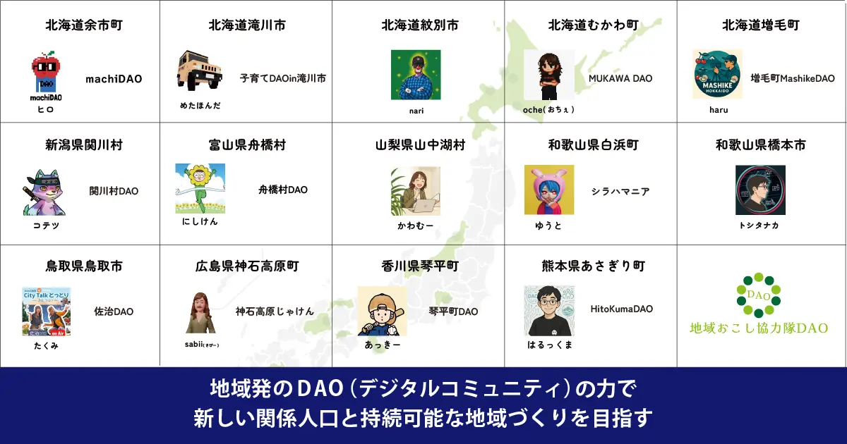 地域おこし協力隊として移住し、DAOのリーダーとして活躍する全国のマネージャーをパネル展示で紹介します。各地域のDAOコミュニティにすぐに入れるQRコードも用意し、来場者に地域のリーダーと地域課題を伝えることで、地域の関わりしろを想起してもらい関係人口の創出を狙います。