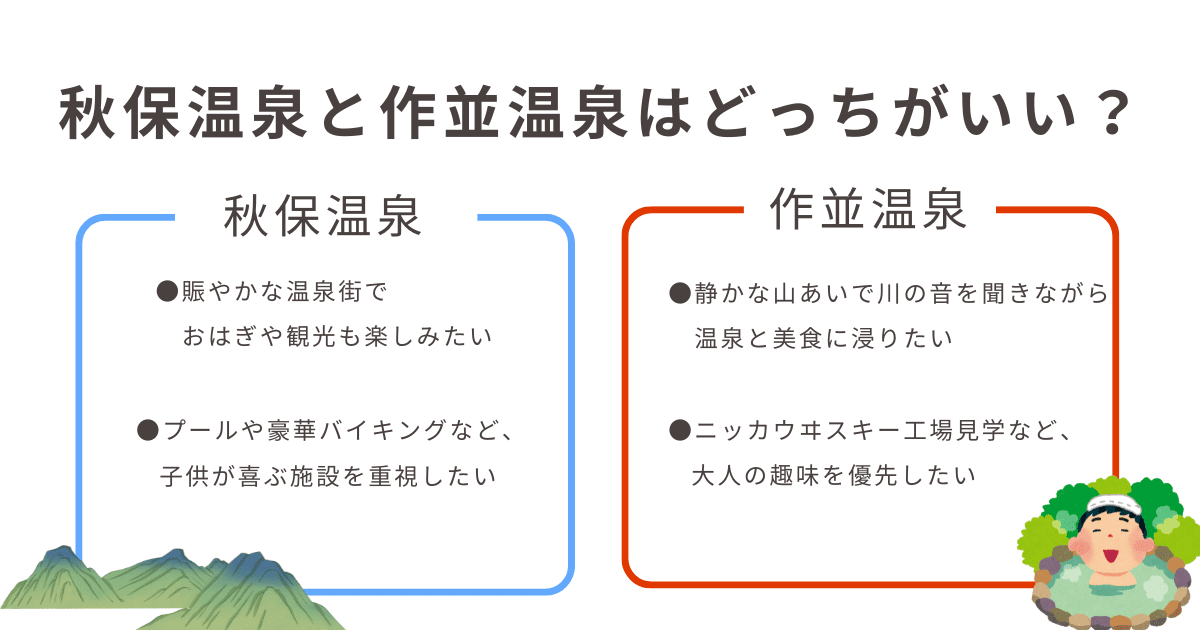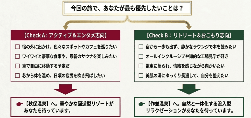 - 迷ったら「アクティブな秋保」か「リラックスの作並」かで直感的に選ぶ
