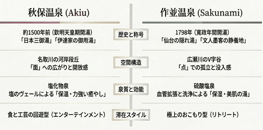 | 比較ポイント | 秋保温泉(あきう) | 作並温泉(さくなみ) |