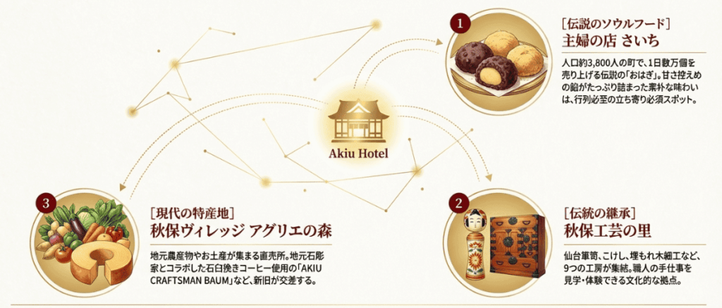 秋保温泉は、一歩宿を出れば活気に満ちています。伝統工芸に触れられる秋保工芸の里や、名物のおはぎを求めて行列ができるスーパー「さいち」など、温泉街全体に歩く楽しみがあります。