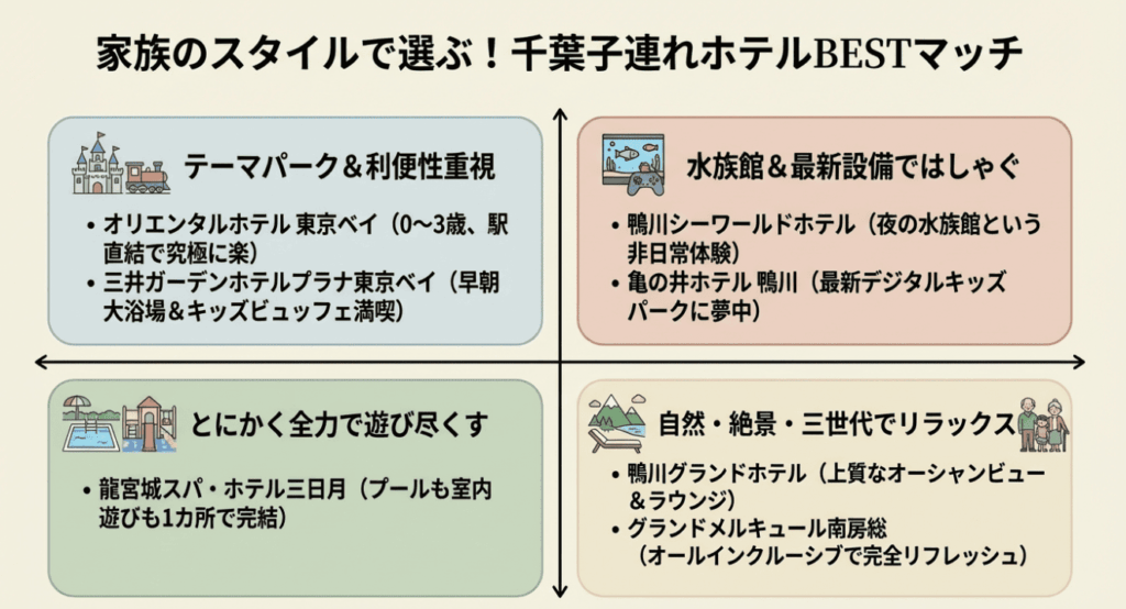 まずは、千葉県内の数あるファミリー向けホテルの中から、特に満足度の高い5つの宿を用途別に厳選しました。以下の比較表を参考に、直感で「ここかも!」と思う場所を探してみてください。