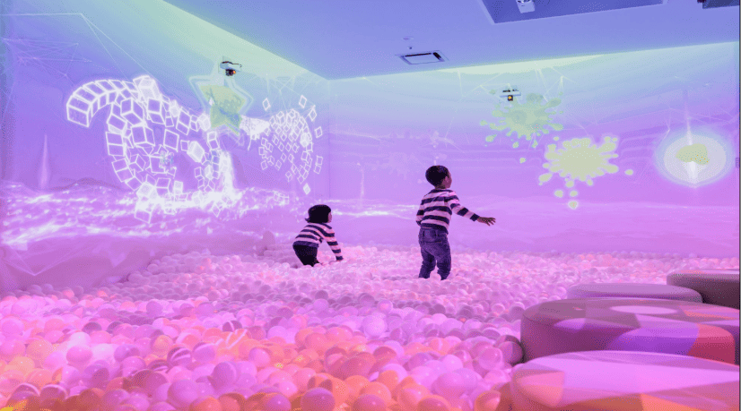 プロジェクションマッピングを駆使した「デジタルボールプール」は、映像に合わせてゲームをクリアしていく演出があり、小学生以下の子供たちが夢中で遊び続けます。