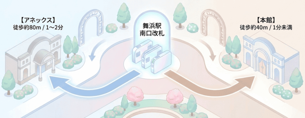 ホテルドリームゲート舞浜の本館とアネックスは、どちらも舞浜駅直結ですが、入り口の方向が異なります。