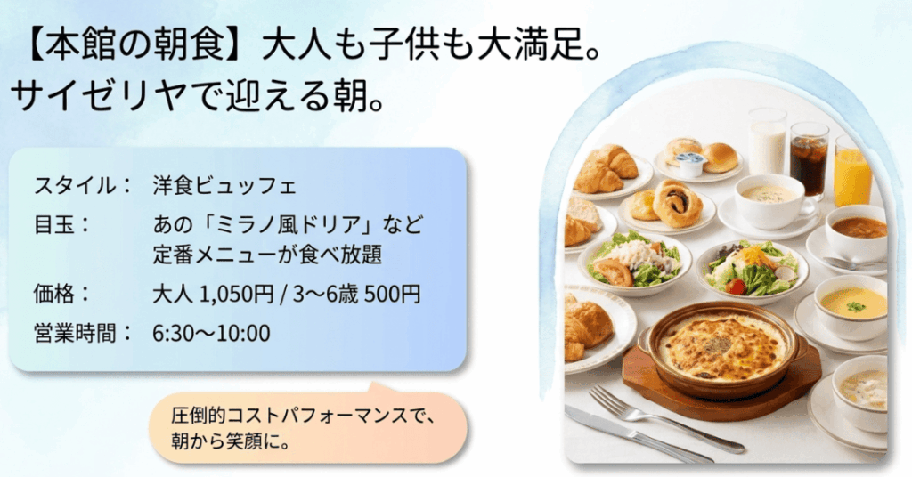- 朝食はサイゼリヤのビュッフェで、リーズナブルにミラノ風ドリアを楽しみたいなら本館