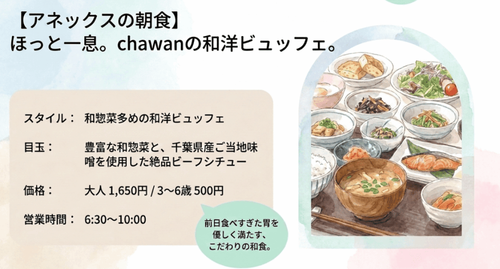 ホテルドリームゲート舞浜本館とアネックスの違いにおいて、アネックスの朝食は大人1,650円、3〜6歳は500円と本館より少し高めの設定です。しかし、その分クオリティの高い和洋ビュッフェが提供されます。