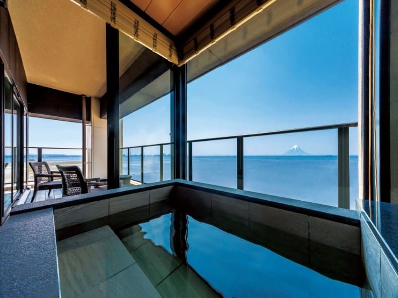 最大の魅力は、全ての客室にオーシャンビューのテラスと半露天風呂が備わっていることです。10階以上の高層階から眺めるサンセットや富士山のシルエットは感動的な美しさですよ。