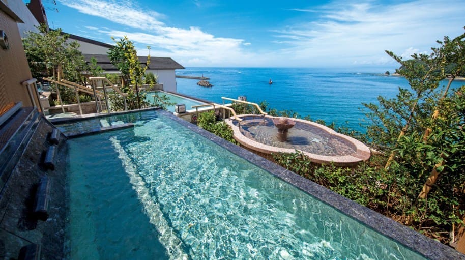 全室テラス・半露天風呂付きのオーシャンビュー客室は、三日月グループの中でも別格の質感があります。