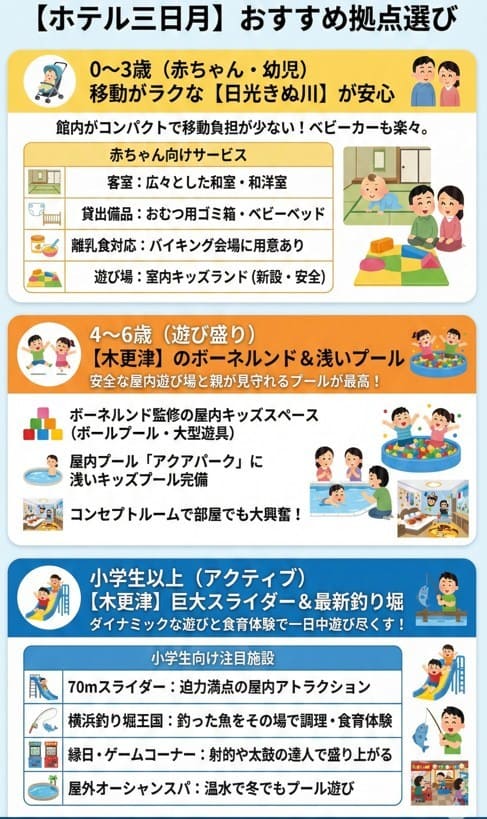 - 赤ちゃん(0〜3歳)連れ:館内の移動がコンパクトで、最新の室内キッズランドがある日光きぬ川が安心