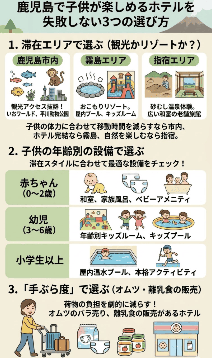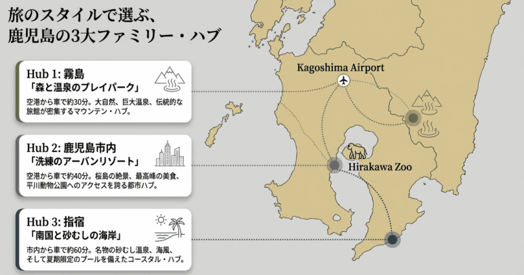 子供の体力を考え、移動時間を最小限にしたいなら鹿児島市内、ホテルの中だけで完結して遊びたいなら霧島、自然と温泉をゆったり楽しみたいなら指宿を選ぶのが正解です。