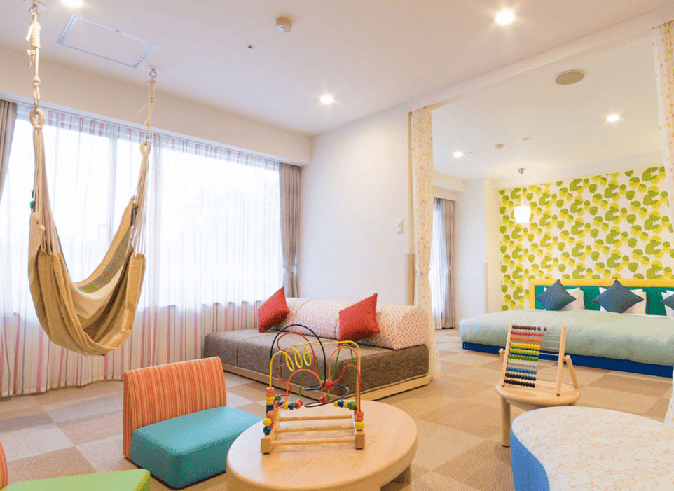 角を丸くした家具や低いベッドを配置した「ベビールーム」があり、オムツ用ゴミ箱や調乳ポットなどの貸出グッズも完璧です。
