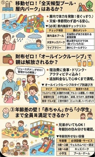- 雨や猛暑に勝てる「全天候型プール」や「屋内キッズパーク」の有無が最重要。