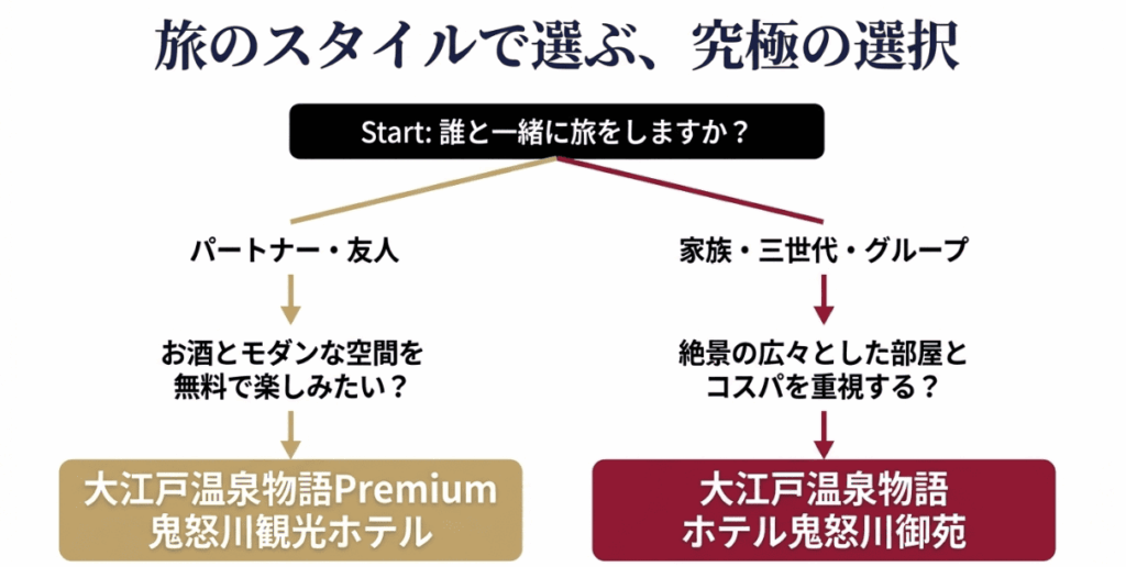 鬼怒川の大江戸温泉物語で「どっちがいいか」迷ったら、贅沢感と新しさを取るならPremium 鬼怒川観光ホテル、コスパと絶景を取るならホテル鬼怒川御苑を選んでください。