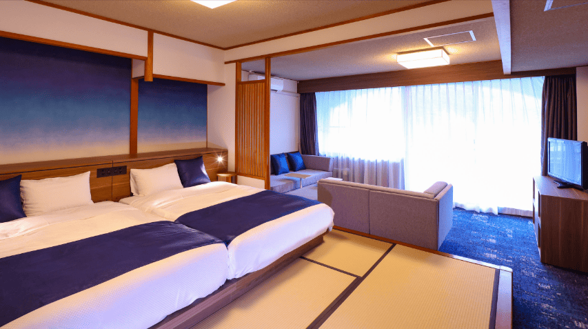 畳の温かみとベッドの快適さが融合した現代的な造りのお部屋もあります。