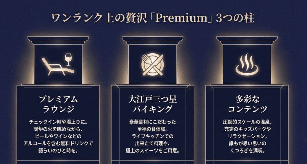 夕食時のアルコール飲み放題や、ハーゲンダッツ食べ放題、さらに滞在中ずっと利用できるプレミアムラウンジのサービスは、数千円の価格差を補って余りある満足感を与えてくれます。