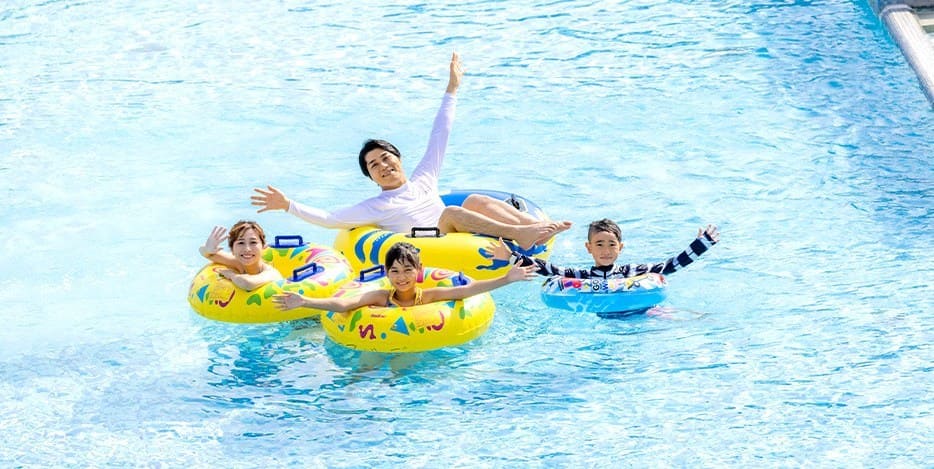 最大の魅力は、夏季限定の屋内プール「アクアビート」と、年中遊べる水着で入る温泉「アクアガーデン」。
