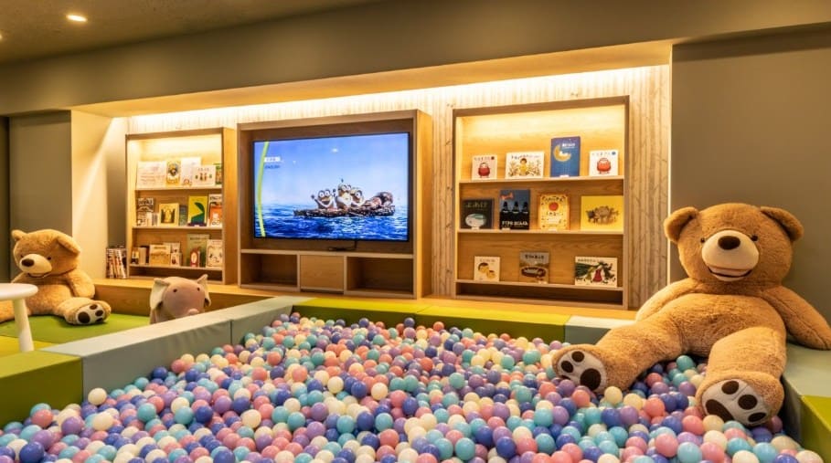 「子供の声はBGM」というコンセプトを掲げ、ロビーには広大な畳敷きのキッズスペース、おもちゃの無料貸し出し、さらには館内通貨を使った駄菓子屋体験まで用意されています。