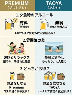 - お酒をあまり飲まない方: 夕食時にお酒を必要としないのであれば、宿泊料金自体がTAOYAより安く設定されているプレミアムを選ぶ方が、無駄なコストを抑えつつ豪華な食事を楽しめるためお得です。