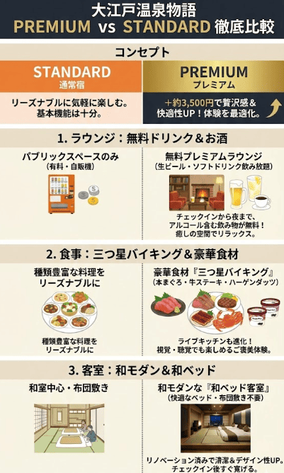 対してプレミアムは、生ビールなどの無料アルコールを楽しめるプレミアムラウンジ、本マグロやハーゲンダッツが登場する豪華なバイキング、そしてリニューアルされた和モダンな客室など、ワンランク上の体験が約束されています。
