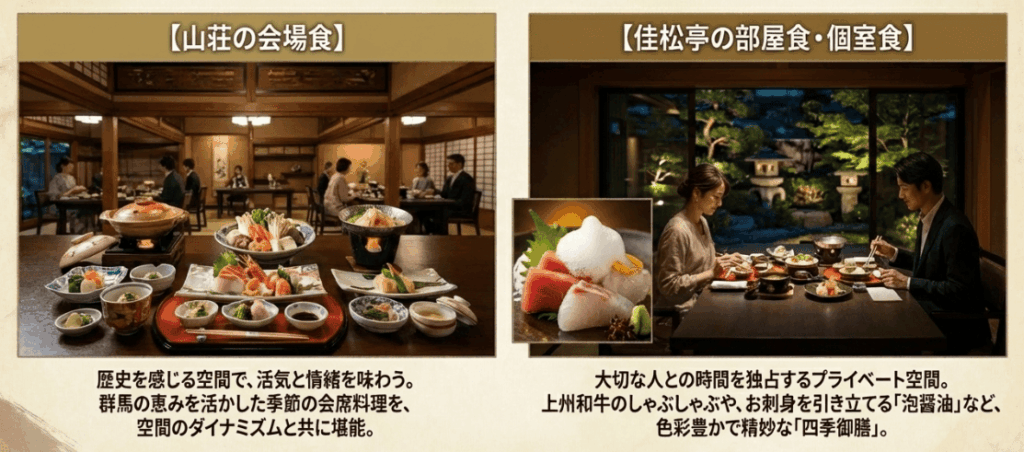 | 食事スタイル | 会場食(落ち着いた食事処) | 部屋食または個室食 |