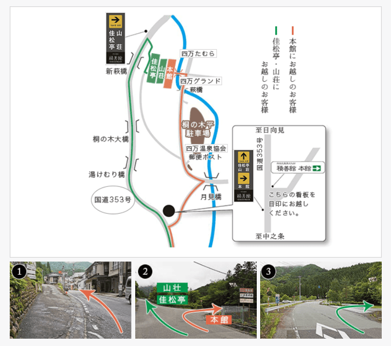 具体的なルートとしては、国道353号線から四万温泉街に入る手前の分岐を、高台方面(左側)へ進む形になります。