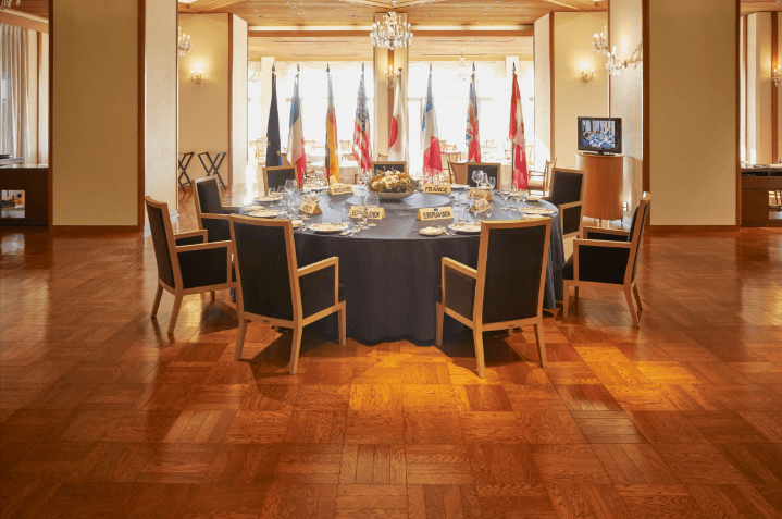 当時の首脳が実際にワーキングランチを囲んだサミットテーブルは、現在もザ・クラブに展示されています。