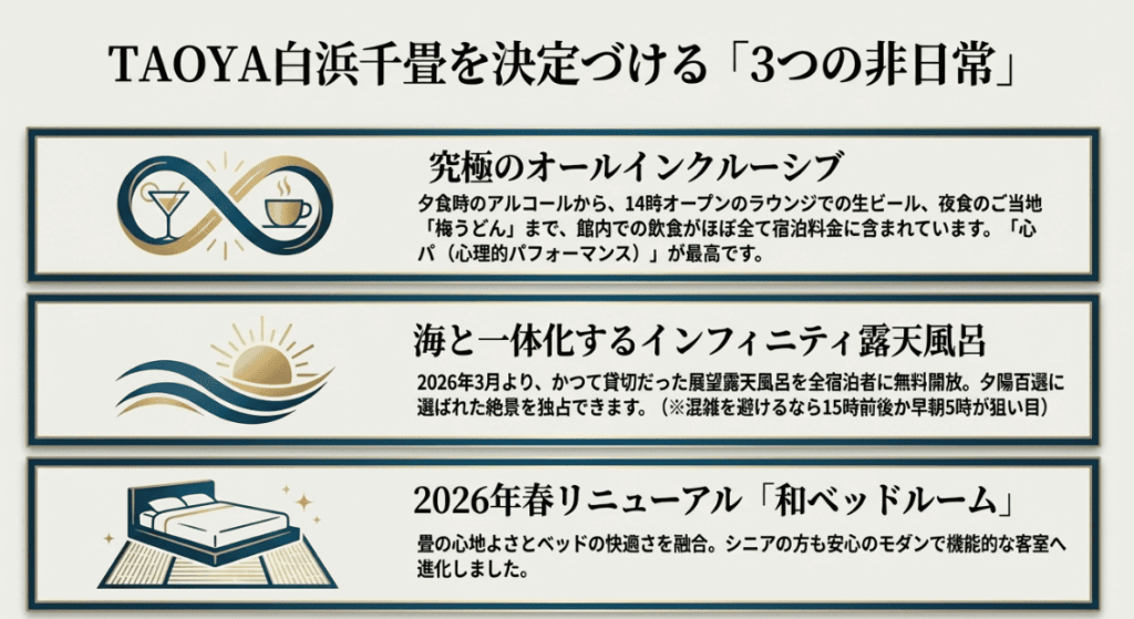 - 2026年3月から展望露天風呂が一般開放され、海と一体化するインフィニティ温泉を宿泊者全員が楽しめます。