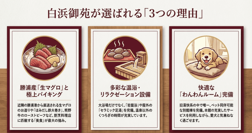 プロのポメ君せっかくの白浜旅行で、「食事が期待外れだった」「子供が退屈してしまった」という後悔をしないためには、今のあなたのスタイルに最適な宿を今すぐ確保することが重要です。
