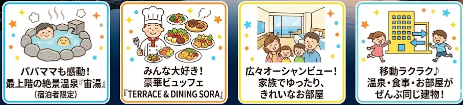 | 宙館: 未就学児・移動を楽にしたい家族 | 食事も温泉も館内で完結する利便性 |