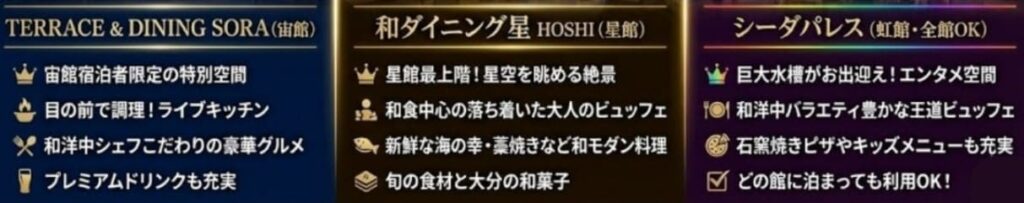 - 3大ビュッフェ(SORA・星・シーダパレス)の特徴と、子連れ満足度の違い。