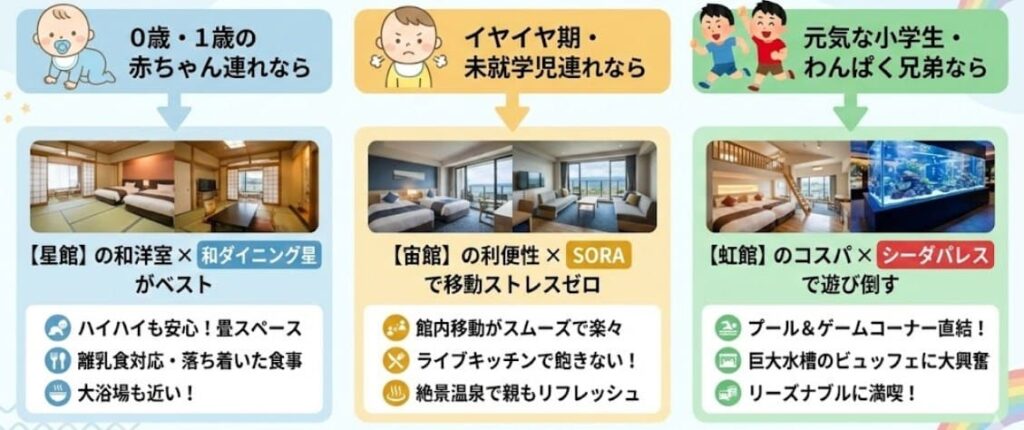 プロのポメ君「館内完結を重視するなら宙館」「移動そのものをイベントとして楽しむなら星館・虹館」を選ぶのが、子連れ旅行を成功させる秘訣ですよ。