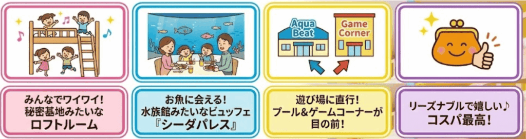 | 虹館:小学生・アクティブ派の家族 | プールへの近さと圧倒的なコスパ |