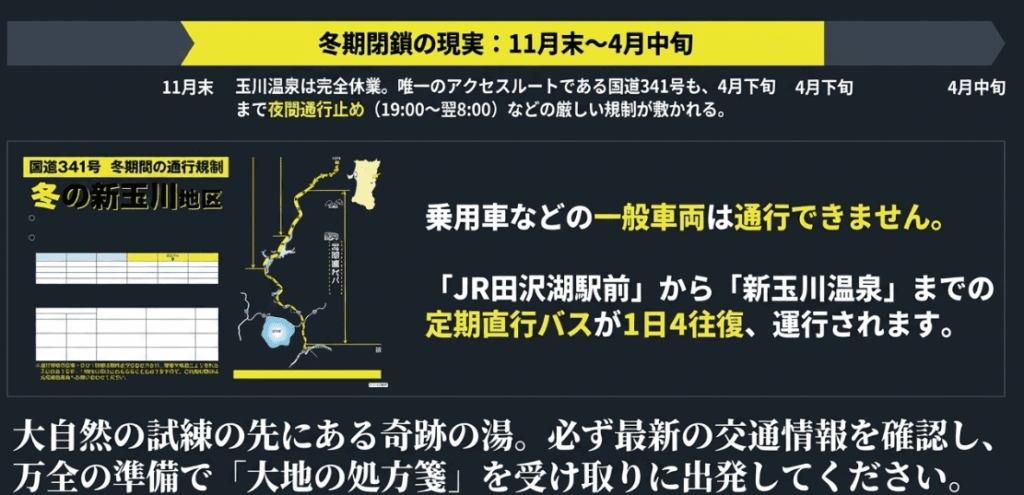 冬期はレンタカーや自家用車で新玉川温泉へ行くことはできません。国道341号線の特定区間が一般車両通行止めとなるため、アクセスは田沢湖駅から出る路線バス(冬期専用便)が唯一の手段となります。