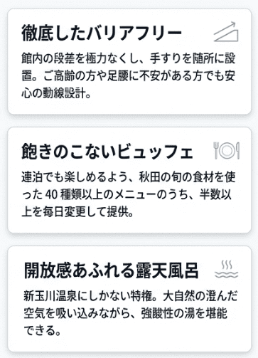 1つ目は、館内にエレベーターが完備されており、大浴場や食事会場への移動が非常にスムーズなこと。2つ目は、手すりの設置や段差の解消といったバリアフリー対策が徹底されていること。そして3つ目は、入浴相談室に看護師が常駐しており、足腰への負担が少ない入浴方法をプロの視点でアドバイスしてもらえる点です。