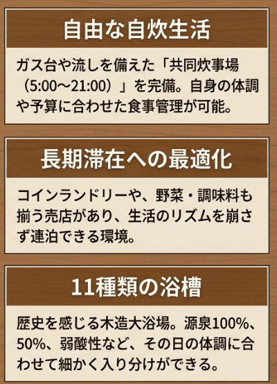 「ちょっとお湯が恋しくなった」「少し体が冷えた」と思えば、すぐに宿の温泉に戻れる距離感は、長期滞在の湯治客にとって非常に大きな安心感に繋がっています。