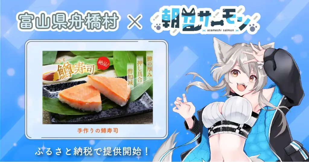 富山県舟橋村がVtuber「朝召サーモン」とコラボ!富山名物の鱒寿司をふるさと納税の返礼品として提供開始!