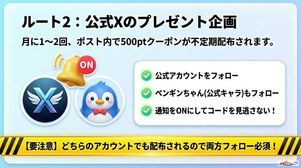 その他にも、公式X(旧Twitter)でのプレゼント企画や毎日のログインボーナスなど、無課金でポイントを貯める手段が豊富に用意されています。