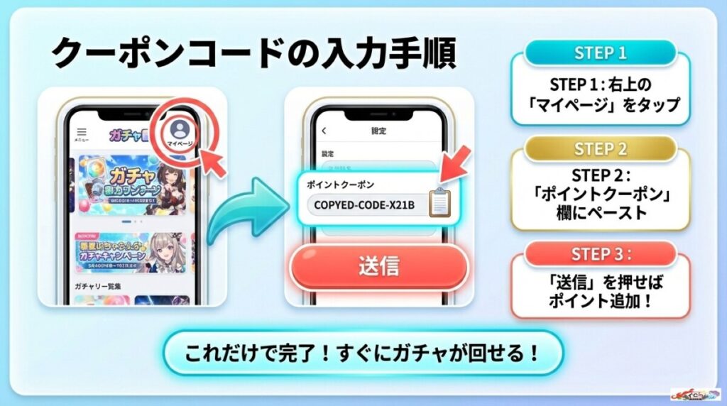 専用クーポンならエラーなくポイントが付与されるため、安心してお得にガチャを楽しめます。