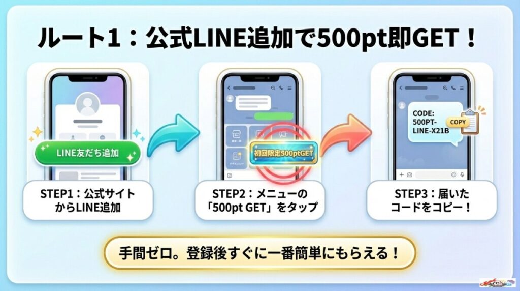 しかし、その分「公式LINEの友だち追加」で誰でも迷わず500ptのクーポンがもらえる仕組みが用意されています。