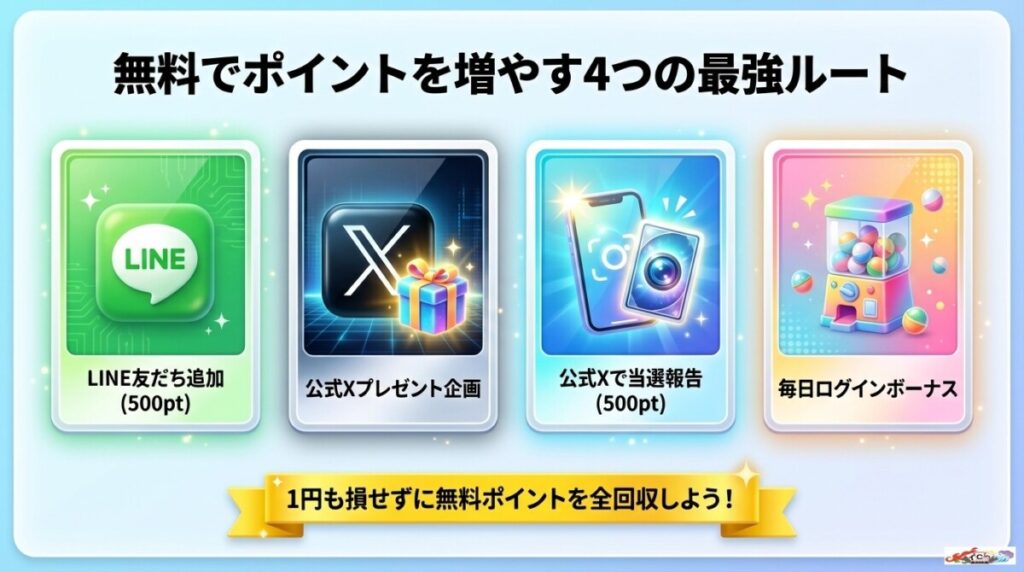 その他にも、公式X(旧Twitter)でのプレゼント企画や毎日のログインボーナスなど、無課金でポイントを貯める手段が豊富に用意されています。
