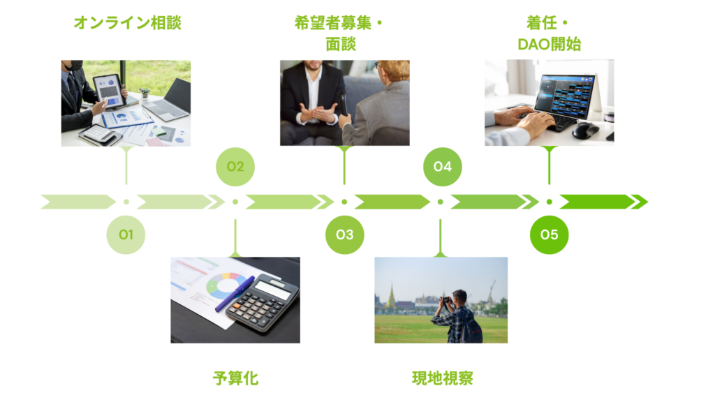 まずはZOOMで30分〜1時間の無料相談。貴自治体の課題感をお聞きし、地域おこし協力隊DAOで何ができるかを具体的にご説明します。ご希望があれば代表が直接現地にお伺いすることも可能です。