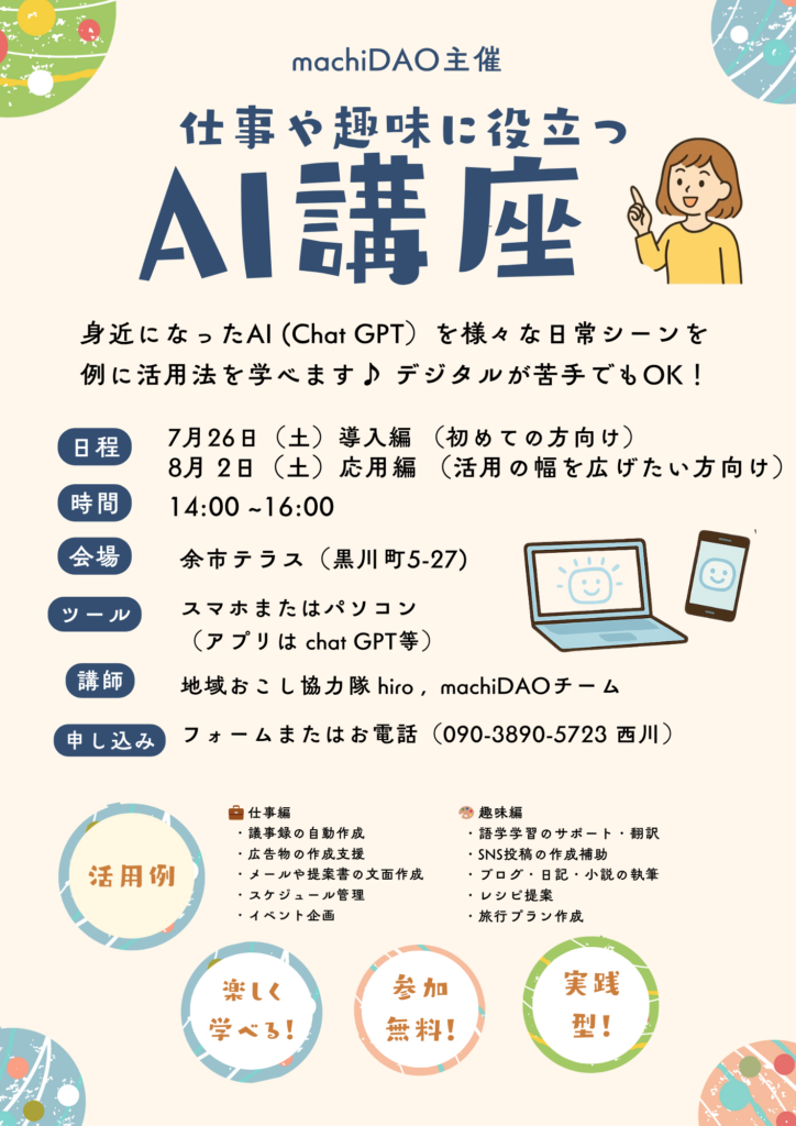 テーマはAI動画生成ツールの使い方、AIボイスチェンジャーの体験、Web3の基礎勉強会など。こちらは余市町広報誌にも「ITスキルアップ勉強会を毎週開催」と紹介されており、オフラインとオンラインの両面でデジタル学習の機会を提供し続けています。